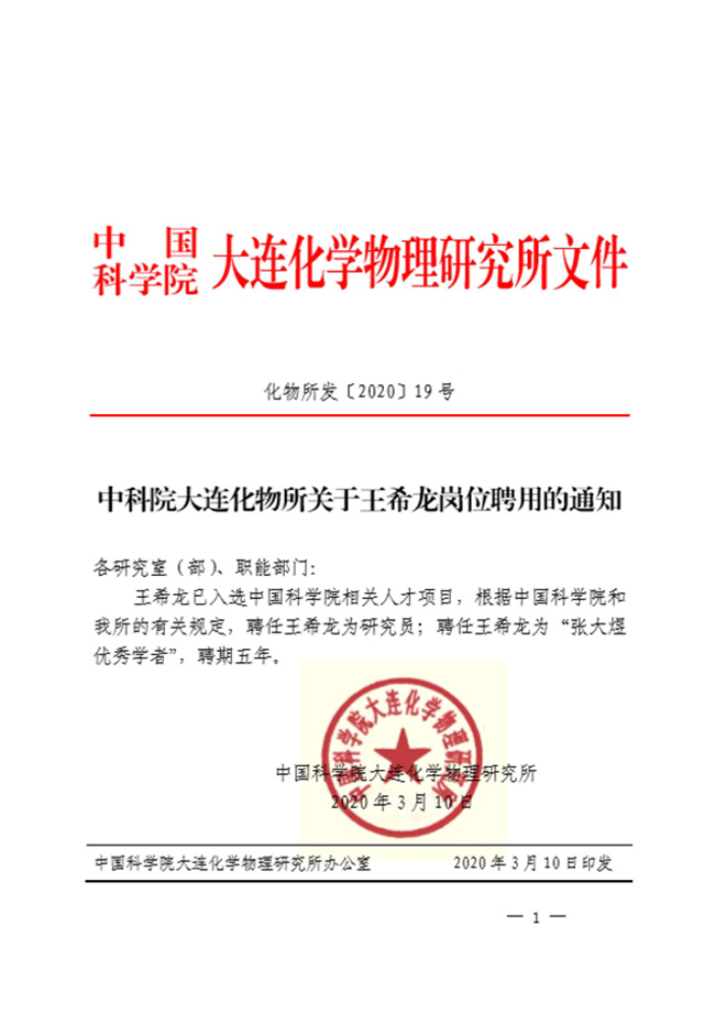 中科院大连化物所关于王希龙岗位聘用的通知
