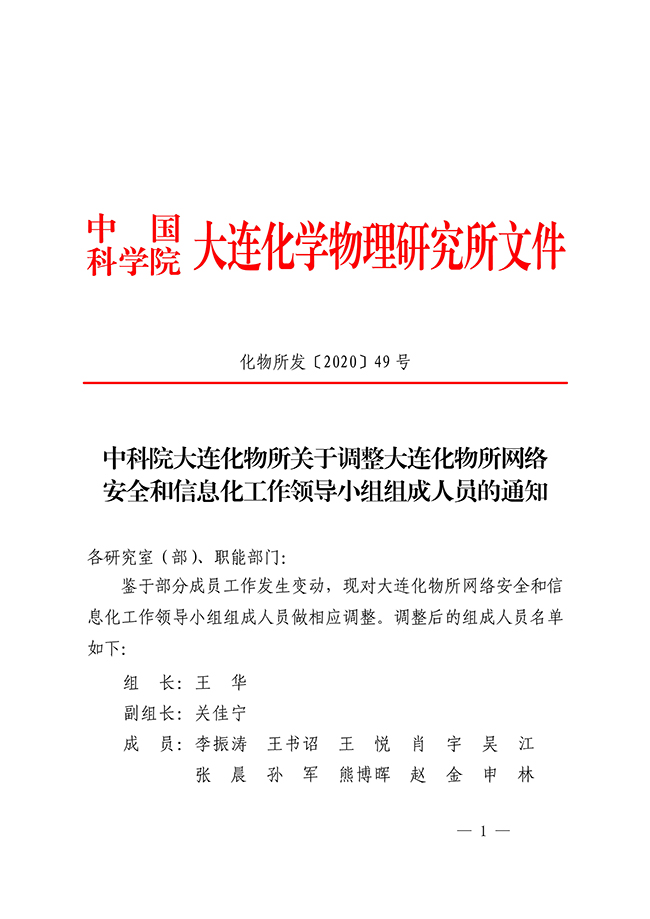 中科院大连化物所关于调整大连化物所网络安全和信息化工作领导小组组成人员的通知