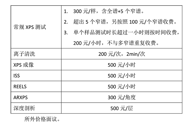 X射线光电子能谱仪已结束试运行,将于10月9日正式开放使用。请所内用户登录中科院仪器共享系统,搜索“准原位X射线光电子能谱仪”,进行在线预约,其中样品信息按送样登记情况填写。送样地点:基础楼5号楼212-1室,联系人:贾老师,jiazh@dicp.ac.cn。所内测试收费标准:
