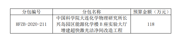 辽宁宏发工程管理咨询有限公司受中国科学院大连化学物理研究所的委托,对中国科学院大连化学物理研究所长兴岛园区能源化学楼B座实验大厅增建超快激光洁净间改造工程项目进行国内公开招标,欢迎符合资格条件的投标人报名参加投标。