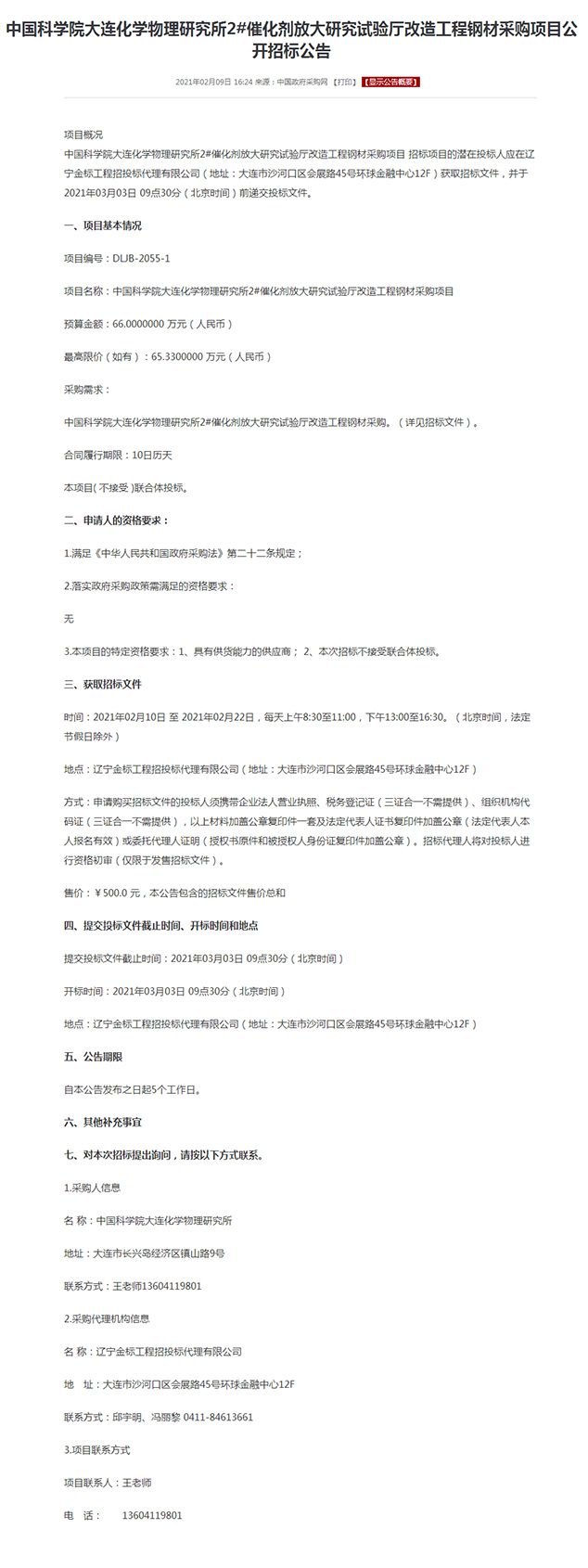 中国科学院大连化学物理研究所2#催化剂放大研究试验厅改造工程钢材采购项目公开招标公告