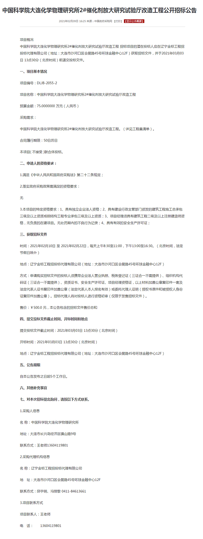 中国科学院大连化学物理研究所2#催化剂放大研究试验厅改造工程公开招标公告