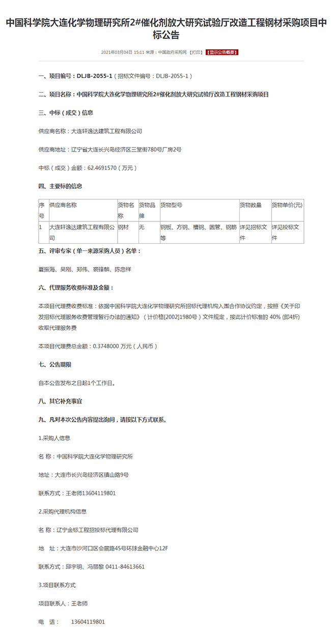 中国科学院大连化学物理研究所2#催化剂放大研究试验厅改造工程钢材采购项目中标公告