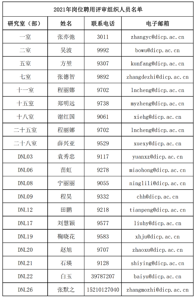 现将各研究室(部)岗位聘用评审组织人员名单及联系方式公布如下,研究室(部)申报正高级、副高级、中级及以下岗位的审核表及相关材料报送到各研究室(部)评审组织人员。