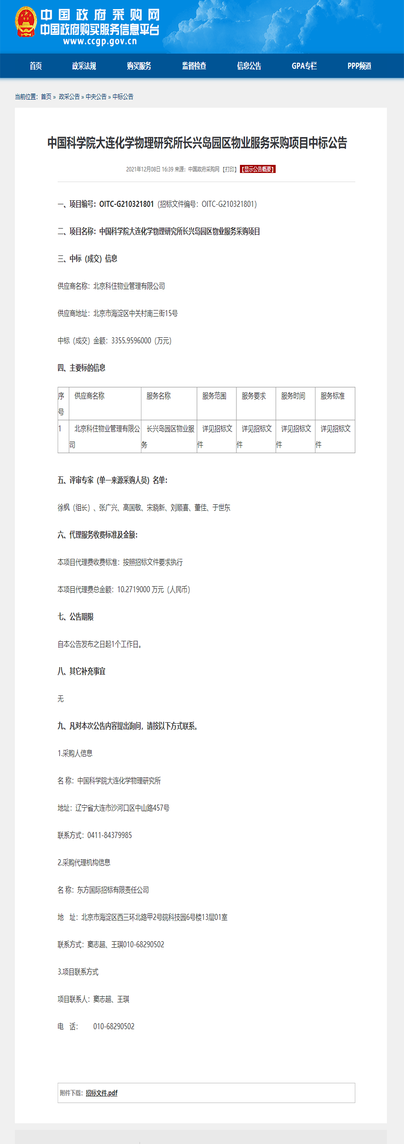详见:中国政府采购网发布的中国科学院大连化学物理研究所长兴岛园区物业服务采购项目中标公告