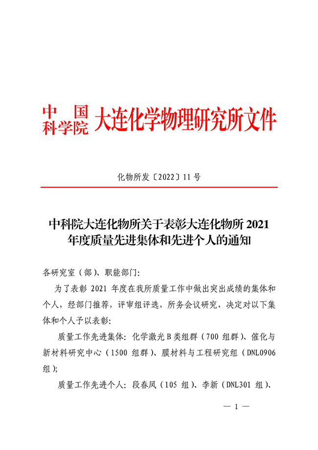 中科院大连化物所关于表彰大连化物所2021年度质量先进集体和先进个人的通知