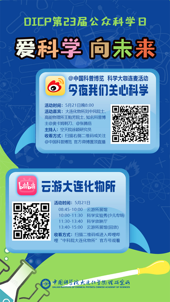 2022年是党的二十大召开之年,是开启第二个百年奋斗目标新征程之年。为了向社会全面展示大连化物所的重大科技创新成果,大力弘扬科学家精神,普及科学知识和科学方法,我所将于5月21日举办第23届“公众科学日”对外开放活动。