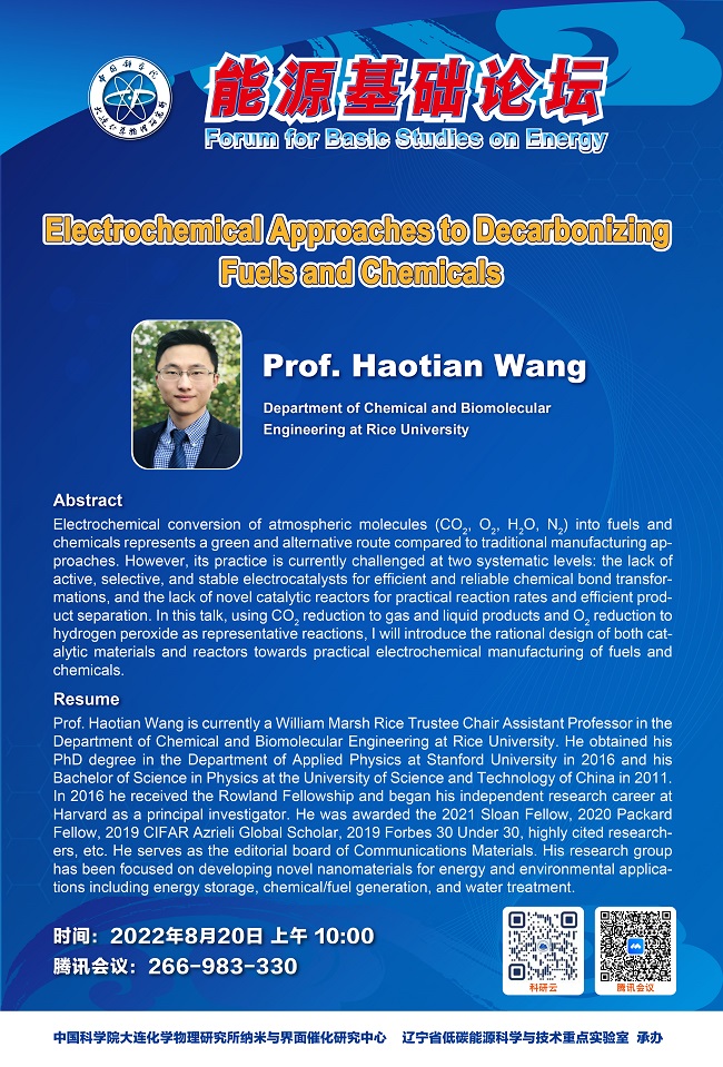关于举行“能源基础论坛:Electrochemical Approaches to Decarbonizing Fuels and Chemicals”学术报告会的通知