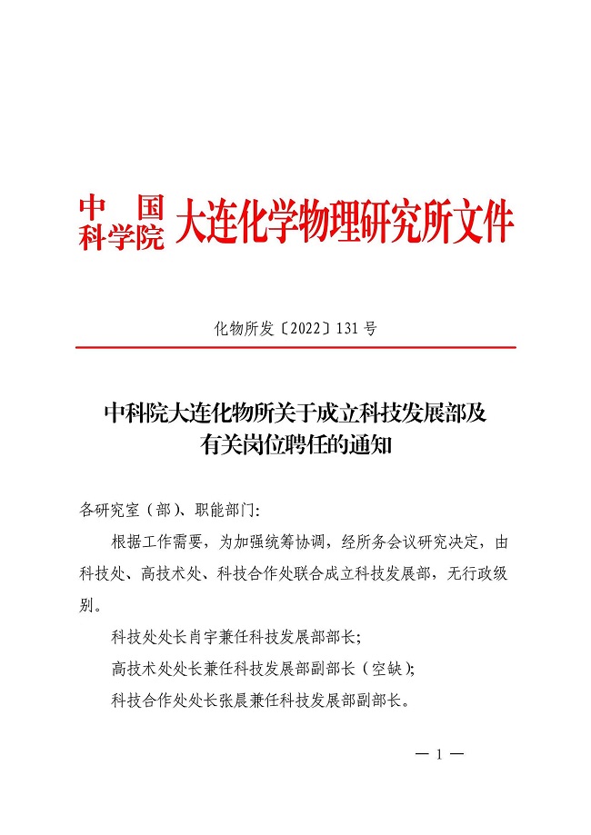 中科院大连化物所关于成立科技发展部及有关岗位聘任的通知