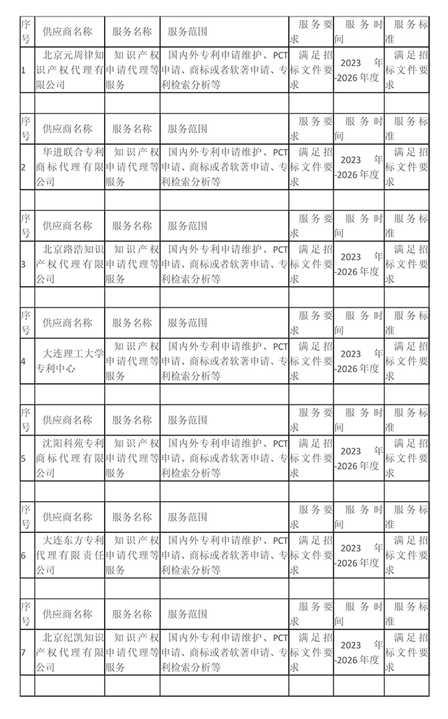 详见中国政府采购网发布的中国科学院大连化学物理研究所2023年至2026年度知识产权代理服务中标公告。