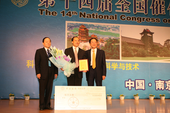 “中国催化奖”包括 “中国催化成就奖”(冠名张大煜奖)和“中国催化青年奖”。“中国催化成就奖”是我国催化委员会颁发的最高学术奖励。奖励在催化科学和技术研究中做出原始创新性或创造性成果、对中国催化科学的发展或对我国催化重大应用方面做出突出贡献的中国催化科学工作者。获奖者应具备严谨的学风,在国内外催化界有较大的影响和较高的认可。主要奖励近十年内所取得的成就。“中国催化青年奖”是奖励在催化科学和技术研究中做出创造性成果、为催化科学和催化应用的发展做出突出成绩的中国青年催化科学工作者,获奖者应具备严谨的学风,在国内催化界有一定的影响和认可。“中国催化奖”每两年评选一次(与全国催化大会召开年同步),一般每次评选“成就奖”1人,“青年奖”2人。由中国化学会催化委员会颁发荣誉证书及奖金。如无合适人选,可以空缺。在2006年兰州举行的第十三届全国催化大会上,中石化石油化工科学研究院闵恩泽院士获得了首届“中国催化成就奖”,清华大学徐柏庆教授和我所刘中民研究员获得了首届“中国催化青年奖”。(文/林红艳 摄影/务实)