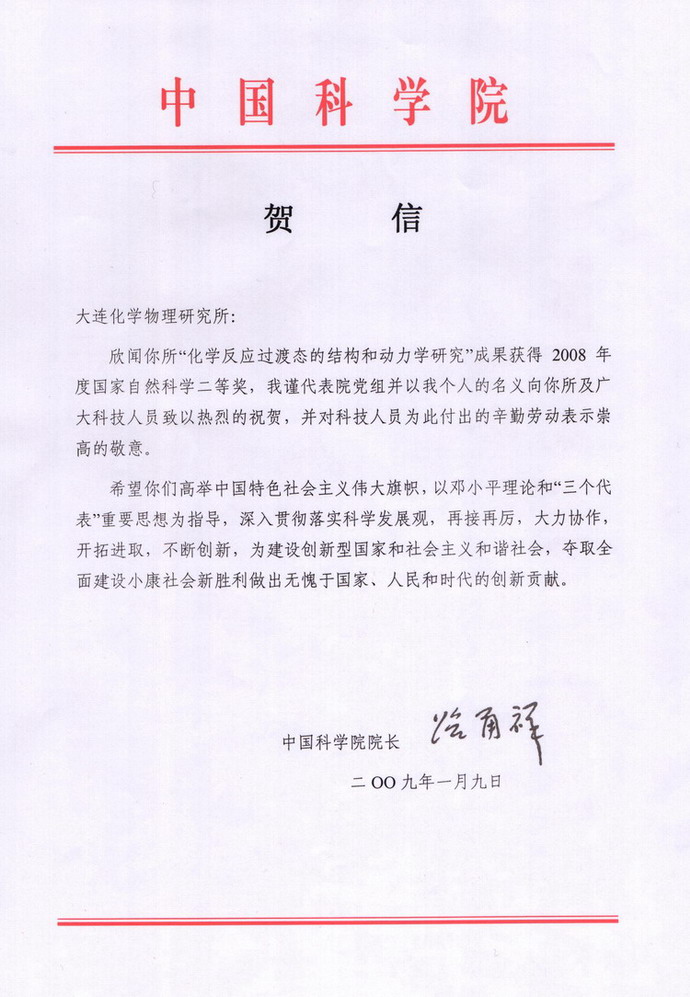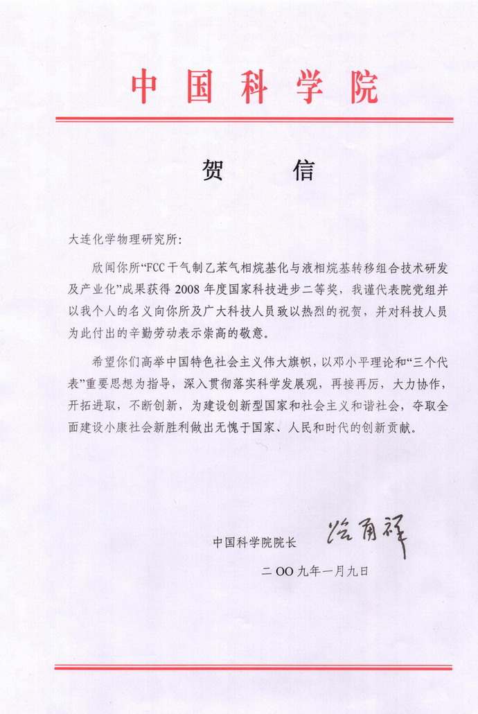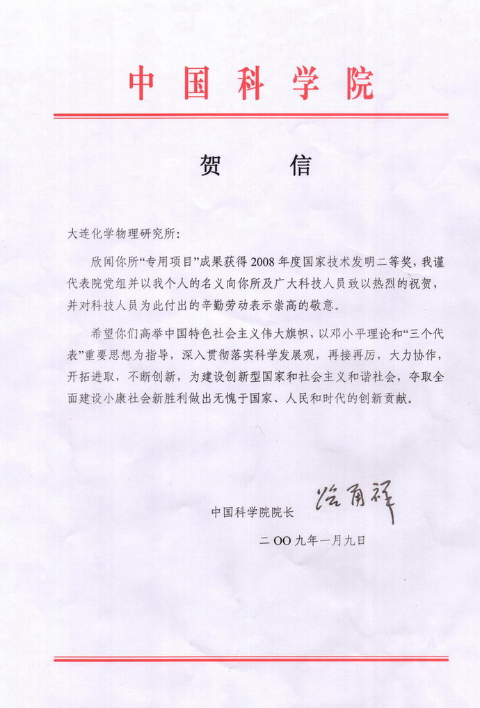 获悉我所“化学反应过渡态的结构和动力学研究”、“专用项目”、“FCC干气制乙苯气相烷基化与液相烷基转移组合技术研发及产业化”三项目荣获国家自然科学二等奖、国家技术发明二等奖、国家科技进步二等奖,路甬祥院长发来贺信,对我所及广大科技人员表示热烈的祝贺,并对大家的辛勤工作表达了崇高的敬意。
