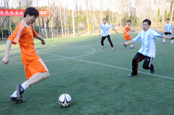 揭幕战由上届冠军五室队迎战八室联队。比赛中,双方队员积极拼抢,默契配合,展开了激烈的角逐,最终八室联队以5:1战胜了五室队,场外啦啦队气氛异常热烈,为场上精彩和配合叫好,为错过进球机会而叹息。比赛期间,穿插了足球趣味游戏,每场游戏由三位男生和三位女生参加,游戏内容有定点射门、绕障碍物带球射门、颠球比赛等,既锻炼了身体,又带来了欢乐!
