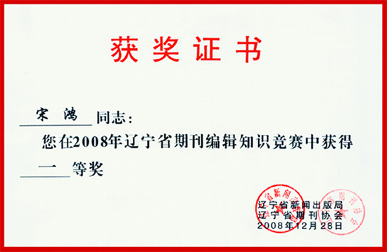 2008年底,宋鸿同志参加了辽宁省新闻出版局组织的辽宁省编辑知识竞赛。近日,获悉竞赛成绩,宋鸿同志在530多名参赛选手中脱颖而出,名列第8名,荣获一等奖。(文/杨宏)