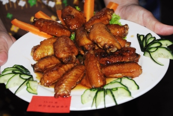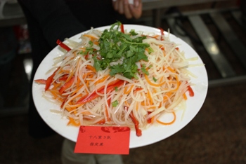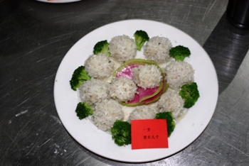 一室代表队的蓑衣丸子,圆润悦目,爽口怡人,配以西兰花点缀,实乃佳作;机关队的红烧肉,褐而不焦,肥而不腻,品尝过后回味无穷;十八室一队的蒜茸粉丝扇贝,白嫩精神,汁多味鲜,令人啧啧称叹;十一室代表队的香波咕唠肉,酸甜可口,色泽红亮,型味俱佳;十八室三队的年年有鱼,创意十足,黄瓜雕成的一只青蛙坐在盘上,使此菜别有一番风采;以上这些菜征服了评委和观众,都得到了特色菜环节的高分。在指定菜——炒土豆丝这一环节,十一室代表队以其完美的刀工,绝佳的口感,恰到好处的点缀,让评委和观众开了一回眼界,得到了此环节的最高分。在本次比赛最能拉开分数档次的是包粽子环节,拥有三名研究员助阵的十五室—十九室联队,在45分钟之内,得到了符合标准的85个粽子;十五室一队稍逊,得到81个成品,这两支队伍也将其他竞争对手远远抛在后面。
