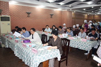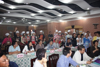 5月27日下午1点,研究生大厦餐厅济济一堂, 13支代表队、65名队员、12名评委和所内职工、研究生共200余人聚集在此,共同期待着这一大显身手展露绝活的时刻。随着主持人的开始口令,各参赛队包粽子、炒土豆丝、做特色菜,纷纷亮出了绝活,忙得不亦乐乎。两轮比赛下来,短短四十五分钟之内,各参赛队给评委和观众们献上了一道道色泽鲜丽,型味俱佳的作品。评委们对每支队的指定菜和特色菜从色感、香感、味感、形感及营养五个方面进行了认真评价,并亮出了评分。