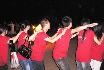 7月21日晚上7点,经研究生会的精心策划,作为夏令营活动内容之一的“篝火联欢”派对在星海湾浴场隆重上演。晚会中,化物所的优势节目——歌唱、小品、相声一一亮相。游戏环节调动了每个队员的积极性,使大家的快速反应和团队协作精神很好的结合在一起。在参加夏令营活动的同学们中,也不乏多才多艺者,来自北京化工大学的王冠雄带来的手风琴演奏和四川大学的李秋鸿的独唱,赢得了阵阵喝彩。随着熊熊的篝火点燃,同学们跳起了兔子舞,将晚会的气氛推向了高潮。