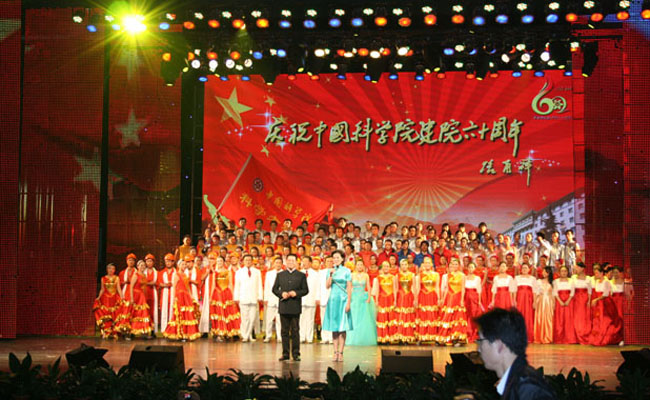 10月25-27日,中国科学院院庆60周年文艺汇演在北京展览馆剧场隆重举行。汇演包括来自京区和京外各所的18个精彩节目,充分歌颂了科学院的科技人员为国家富强和科技事业做出的重要贡献,展示了良好的精神风貌。