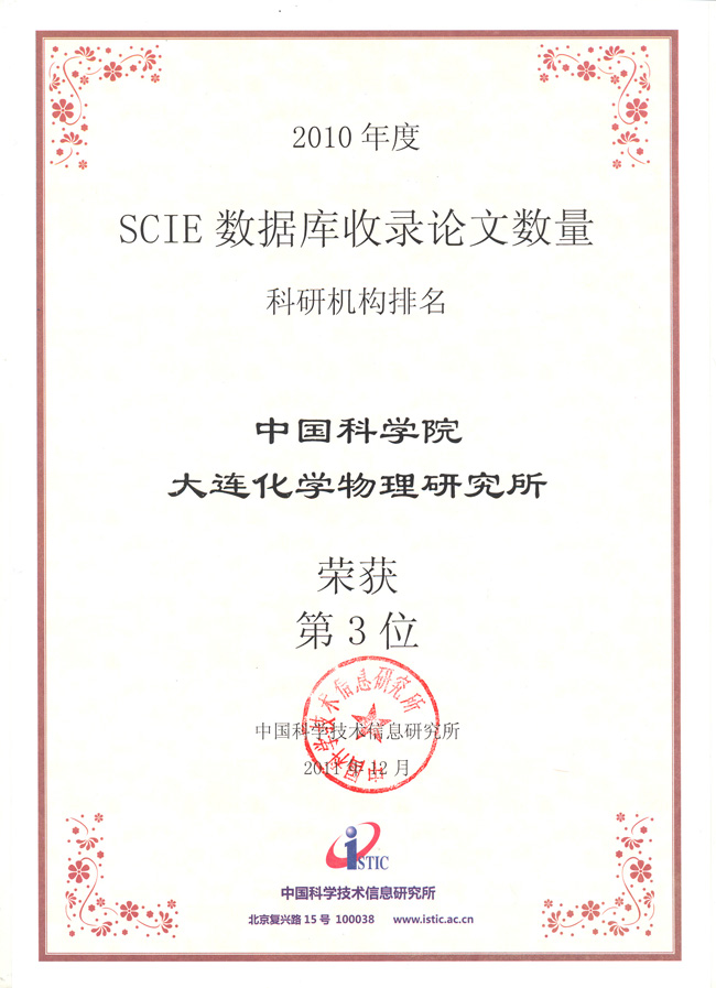 2010年度表现不俗的论文数量达137篇,在全国科研机构排名第5位;我所杨学明、张东辉等的“Depression of reactivity by the collision energy in the single barrier H + CD4 -> HD + CD3 reaction” (发表在Proceedings of the National Academy of Sciences of the United States of America) 获“2010年中国百篇最具影响国际学术论文”殊荣。