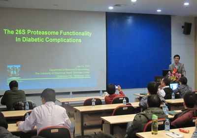 12月27—29日,应生物技术部天然产物及糖工程课题组杜昱光研究员邀请,美国俄克拉荷马大学许健博士来所进行为期三天的学术访问,与生物技术部的职工和学生进行了广泛的交流,并在访问期间作了题为““The 26S proteasome Functionality in Diabetic Complications”的学术报告。杜昱光研究员主持了报告会,我所生物化工相关领域的研究人员和学生到场听取了报告。