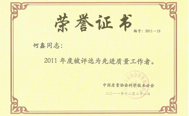 何鑫获先进质量工作者荣誉称号