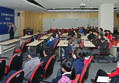 杜辉教授旁征博引,语言幽默诙谐,从古朴厚重的古城西安,讲到博大正统的北京城,再到奢华精致的大上海,通过对比,杜教授提出了大连与众不同的城市文化特色——明快而务实。而后,杜教授从“三缘”即业缘、史缘、地缘三个方面及大连“三民”文化,即殖民、移民、渔民,对大连的文化产业成就及问题进行了深刻地剖析。