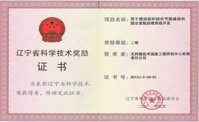 10月15日,天邦公司沈光林正高级工程师率领团队完成的“用于燃油窑炉综合节能减排的膜法富氧助燃系统开发”项目荣获2012年度辽宁省科技进步二等奖。