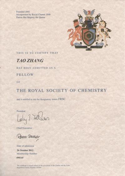 日前,英国皇家化学学会主席 Lesley Yellowlees 教授来信通知:我所张涛研究员被选为英国皇家化学学会会士(Fellow of the Royal Society of Chemistry, FRSC)。
