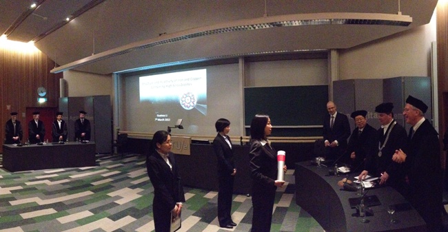 日前,我所催化基础国家重点实验室分子催化和原位表征研究组(503组)毕业博士研究生李冠娜同学作为中荷科学战略联盟项目的参加者,继2012年1月获得中国科学院大学博士学位后,在荷兰埃因霍温工业大学顺利进行了博士学位论文答辩,获得荷兰埃因霍温工业大学博士学位。我所李灿院士作为中荷战略科学联盟合作研究计划项目中方项目负责人和中方合作导师,与荷兰皇家科学院院士Rutger van Santen教授一起,出席了博士学位答辩会。