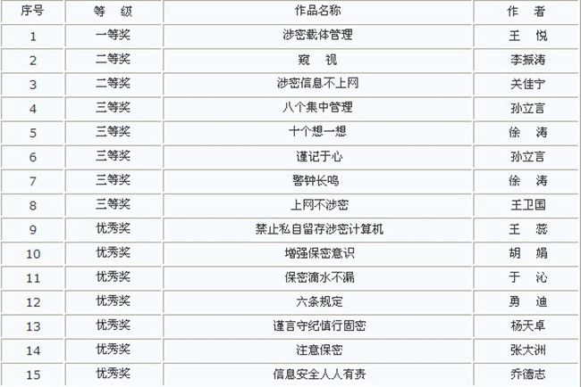 10月10日,保密处邀请来自所内研究室和管理部门的代表,依据“准确性、实用性和艺术性”等标准,对参赛作品进行了评审。最终,王悦的作品“涉密载体管理”荣获一等奖,李振涛的作品“窥视”、关佳宁的作品“涉密信息不上网”荣获二等奖,孙立言的作品“八个集中管理”等五个作品荣获三等奖。保密处将对这些作品进行编辑和综合处理,做成电脑屏保程序供大家下载使用。(文/郭明彦)
