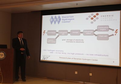 访问期间,Wolfgang Arlt作了题为“Chemical Storage of Renewable Energy”的学术报告,报告会由李灿主持。Wolfgang Arlt介绍了德国当前的能源政策倾向,政府缩减对核能研究的支持,但大规模发展了风能、太阳能等可再生能源,而可再生能源能得以大规模应用主要的瓶颈问题在于储能。Wolfgang Arlt还介绍了巴伐利亚州氢能研究中心的主要科研计划,将太阳能、风能等可再生能源以液体有机氢载体等形式加氢化学储存,需要的时候再进行脱氢,以内燃机或燃料电池等转化形式输出能量。 报告结束后,与会者对报告中所涉及的化学储能等科学研究问题与Wolfgang Arlt进行了热烈的讨论交流。