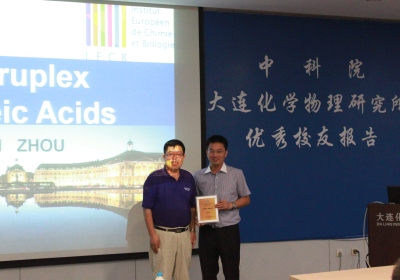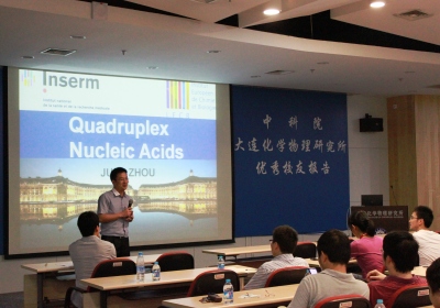 周俊首先回顾了自己在化物所进行的关于人端粒G-四链体DNA在近生理条件下结构和性质方面的研究。然后集中介绍了近两年在欧洲化学与生物学研究所的博士后研究工作。周俊通过对DNA中脱氧核糖进行修饰,发现糖与其它碱基修饰一样,同样对G-四链体性质有显著的影响。另一方面,传统观点认为G-四链体只能由一条链,两条链或四条链形成,周俊所在实验室成功地构建了一个三条链形成的G-四链体结构,证明了G-四链体也可以由三条DNA链形成,这一研究被F1000 网站评论为“新发现”。最后,周俊还就四链核酸在纳米生物技术上的应用做了简要介绍并与大家分享了在大连化物所的求学经历和在欧洲化学与生物学研究所从事博士后研究的感受。
