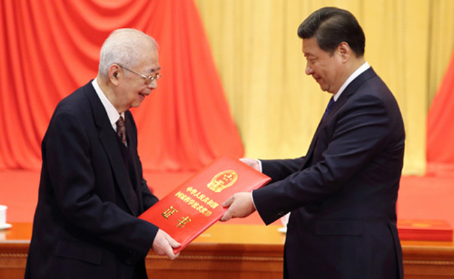 1月10日,2013年度国家科学技术奖励大会在北京人民大会堂隆重举行。中共中央总书记、国家主席、中央军委主席习近平向获得2013年度国家最高科学技术奖的中国科学院院士张存浩颁奖。新华社记者兰红光摄