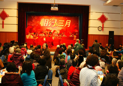 不到早8点,老同志们就怀着喜悦的心情陆续走在通往礼堂的路上,而此时,在礼堂大门口,退休老同志徐哲尧、李爱英夫妇早已架好摄像机在等候大家了。联欢会开始前,礼堂内早已欢声笑语一片,洋溢幸福一片。