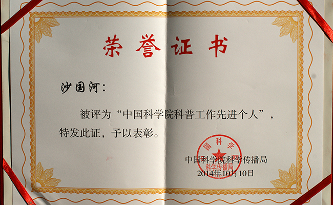 近日,中国科学院公众科学日十周年总结暨科普工作研讨会在北京召开。会上,院科学传播局对我院科普工作先进集体和先进个人进行了表彰。全院共有15个单位获得科普工作先进集体,30名同志获得科普工作先进个人奖项。我所沙国河院士因其在科普事业中的突出贡献,荣获“中国科学院科普工作先进个人”荣誉称号。(文/图 赵冠鸿)