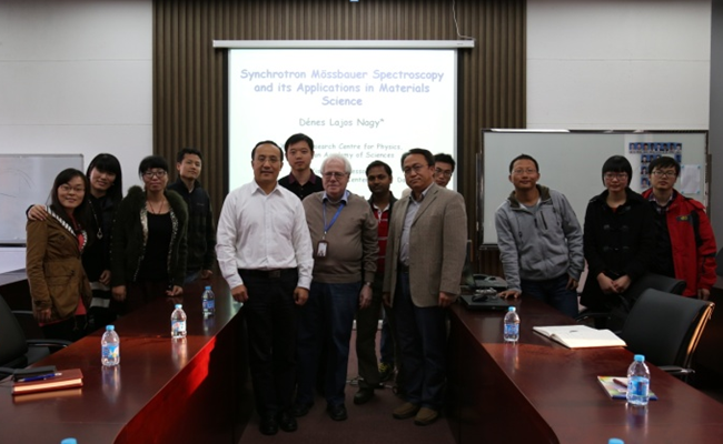 10月28日下午,中科院特聘研究员Dénes Lajos Nagy博士应邀参加了由国际穆斯堡尔数据中心和我所研究生部联合举办的讲座“同步辐射穆斯堡尔谱学及其在材料科学中的应用”。张涛院士、王军虎研究员及其他相关工作人员以及对本次讲座感兴趣的职工和研究生聆听了讲座。
