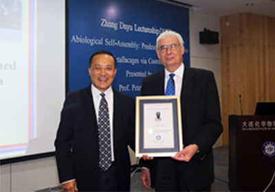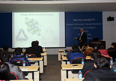 11日上午,Stang在生物楼学术报告厅做了张大煜讲座ⅩⅥ——“Abiological Self-Assembly: Predesigned Metallacycles and Metallacages via Coordination”报告,韩克利研究员主持报告会,所长张涛为Stang颁发了“张大煜讲座”报告证书及荣誉证书。报告中,Stang系统地介绍了含金属配位受体、有机配体的设计合成,利用配位作用构建各种二维多边形、三维多面体超分子结构的方法,并对配位组装化合物的应用前景作出展望。Stang的报告深入浅出,吸引了所内相关研究人员及研究生150余人到场参加。报告结束后,与会人员就感兴趣的学术问题与Stang进行了深入细致的讨论。