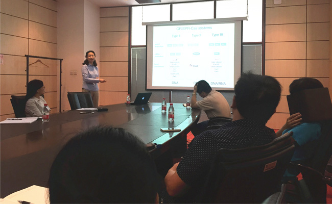 访问期间,Hong Li在生物楼小会议室做了题为“Genome engineering: fighting viruses, designer baby, and cancer research”的精彩学术报告。在报告中,Hong Li从结构生物学和基因组工程技术等方面对CRISPR-Cas途径及在基因工程中的应用进行了详细的阐述。Hong Li还重点介绍了冷冻电镜解析大分子结构技术及采用该技术解析CRISPR-Cas途径中重要酶结构的进展。