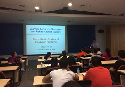 应赵宗保研究员邀请,美国德克萨斯大学奥斯汀校区药学院及化学与生物化学系教授Liu Hung-wen (刘鸿文) 于9月21日至27日来我所进行学术交流,并分别于9月21日和25日上午在生物楼学术报告厅做了题为“Studies of SpnF-catalyzed [4+2]-cycloaddition in the biosynthesis of