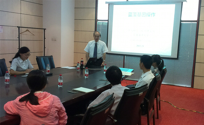 访问期间,施定基在生物楼小会议室做了题为“蓝藻基因操作”的精彩学术报告。在报告中,施定基回顾了蓝藻基因工程的历史,分析了蓝藻基因操作的优势,阐述了蓝藻在农业、医药、环境和能源等方面的应用。会后,施定基与海洋生物工程研究组(1812组)的师生就微藻可控培养、微藻光合生理等问题进行了深入的讨论,并分享了自己丰富的科研经历。