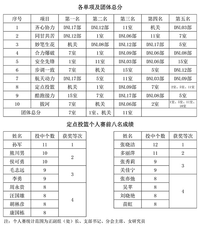 在接近四个小时的活动中,大家全身心投入其中。在各个项目比赛中,各工会分会积极调兵遣将,广大参赛人员服从指挥,展现了高度的组织性、纪律性和较强的团队协作精神以及良好的精神风貌。特别是在集体拔河比赛中,场上运动员鼓足了干劲、全力拼搏,场下助威团也憋红了脸、忘情呐喊。此起彼伏的欢呼声、加油声沸腾了运动现场,也拉紧了大家心中“团队精神”这根绳。随着7室拔河队凭借强大的实力和充分的准备,以压倒性的优势获得拔河比赛冠军,嘉年华活动也接近了尾声。最终各单项及团体总分获奖情况如下: