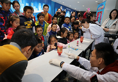 另外,今年恰逢元素周期表发现150周年,活动中孩子们可通过与志愿者的互动收集元素精灵贴纸,最终获得神秘小礼物,这一环节很好地引导孩子们在活动中积极思考,活跃思维。