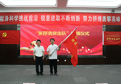 金玉奇向“张存浩突击队”授旗,“张存浩突击队”队长房本杰研究员从金玉奇手中接过队旗,全场响起热烈的掌声。