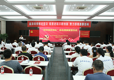 金玉奇向“张存浩突击队”授旗,“张存浩突击队”队长房本杰研究员从金玉奇手中接过队旗,全场响起热烈的掌声。