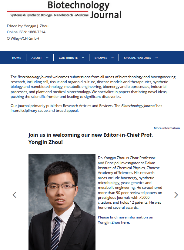 近日,Wiley旗下生物化工期刊Biotechnology Journal宣布,我所周雍进研究员接任Sang Yup Lee院士担任期刊主编,成为Biotechnology Journal创刊以来首位华人主编。