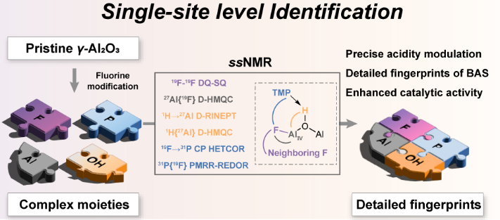 近日,我所催化基础国家重点实验室纳米与界面催化研究中心固体核磁共振及前沿应用研究组(524组)侯广进研究员、纪毅副研究员团队在氟化氧化铝表面酸位点精准解析研究中取得新进展。团队利用高场、超快魔角旋转及多维多核固体核磁共振技术,在原子尺度上实现了对氟化氧化铝表面强Brønsted酸位点结构的精准识别,并揭示其形成机制与催化性能的直接关联。
