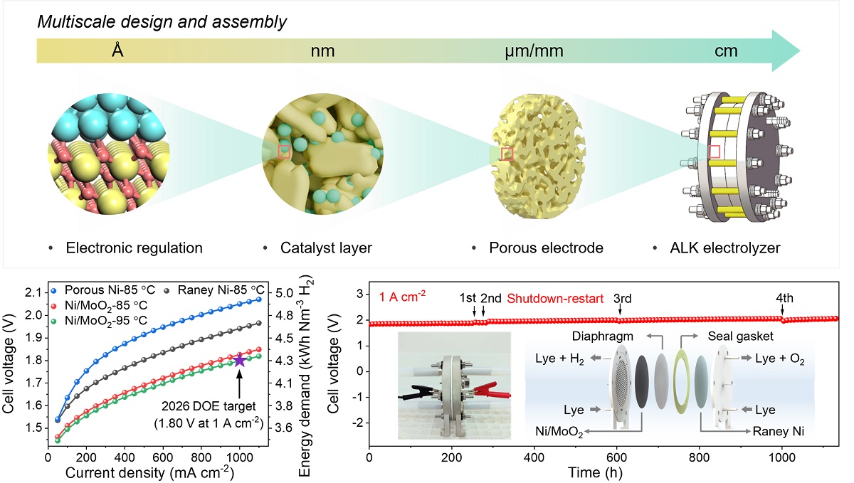 基于该策略制备的电极在1 M KOH电解液中,达到1 A cm-2电流密度仅需145 mV过电位,优于商用Pt/C催化剂(300 mV),并可稳定运行超过3500小时。在实际碱性水电解槽中,该电极在工业条件下(30 wt% KOH,大于等于85 °C)实现1 A cm-2电流密度仅需1.80 V槽电压,对应能耗为4.3 kWh Nm-3 H2,并展现出超过1000小时的运行稳定性。该工作通过从原子到宏观尺度的跨尺度设计,构建了兼具界面电子调控与多尺度孔结构的整体式电极,突破了高电流密度下碱性水电解电极活性与稳定性难以兼顾的技术瓶颈,为开发高效、耐用的制氢电极提供了新思路。