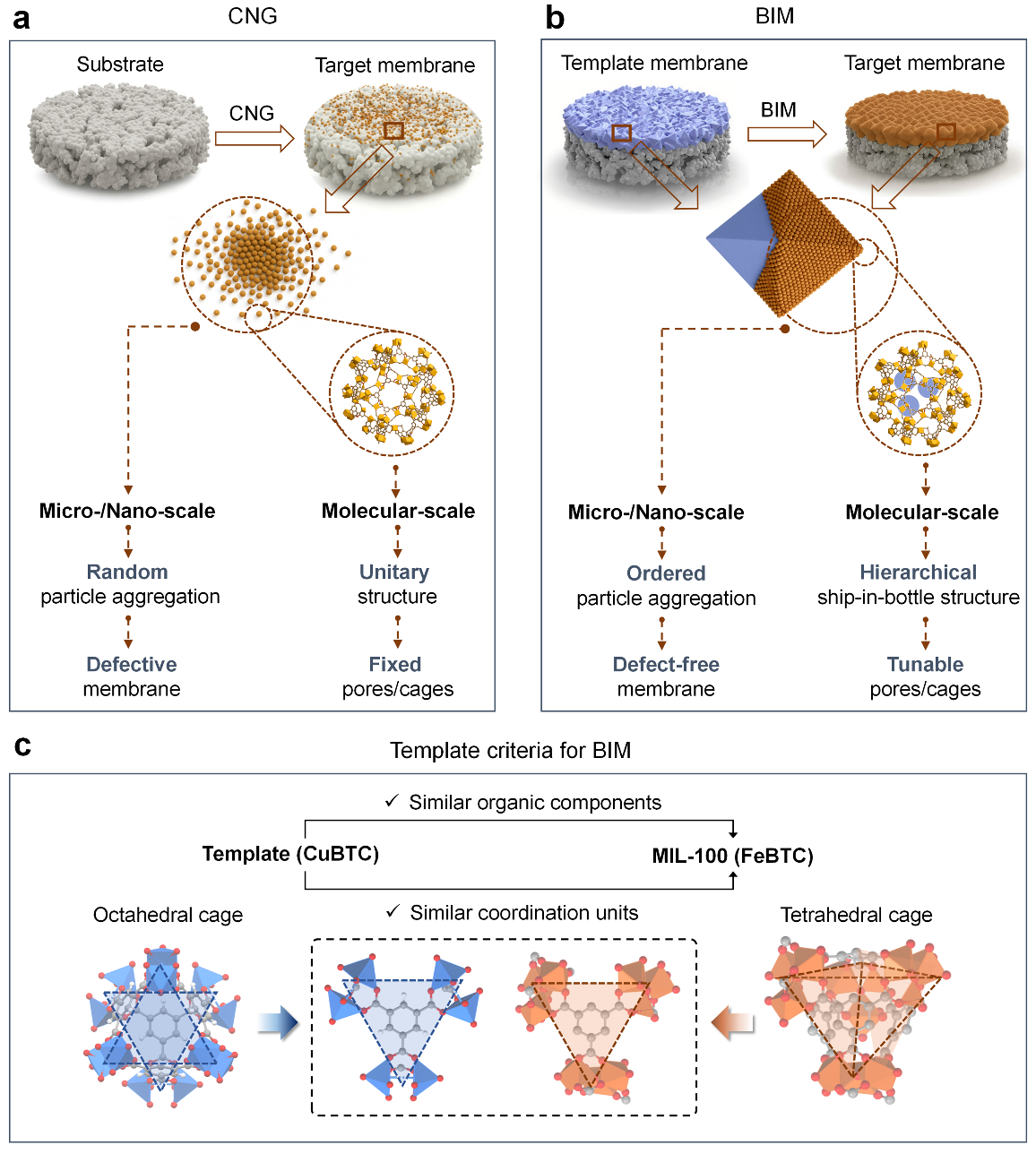 自然界中的生物通过特定的模板指导,可将固定形貌的粒子单元有序组装成多种形态的超级结构,实现特殊的生物功能。例如海星的听小骨、软体贝类动物的贝壳组织等。受这一现象启发,在本工作中,研究团队提出仿生模板矿化策略,以亚稳态、易于成膜的铜基MOF膜(CuBTC)为模板,在铁离子交换驱动下,原位转变为晶相稳定的MIL-100 (FeBTC)膜。研究发现,该过程中CuBTC模板表面的配体组分与结构单元为新晶粒(MIL-100)在模板表面的锚定成核创造了条件,并触发新晶粒沿模板表面进行印迹复制型生长,为晶粒有序聚集提供精确的空间指引,实现了微纳尺度下膜整体架构的精准构筑和调控。同时,模板转化过程中因“部分牺牲”效应,最终以金属—配体纳米团簇的形式原位封装于MIL-100笼中,形成“瓶中船”结构,有效窄化了笼径,实现了筛分窗口的分子水平调控。所构筑的MIL-100膜可对多种水相共沸物(例如乙醇—水、丙醇—水,丁醇—水、乙腈—水等)实现脱水精制。